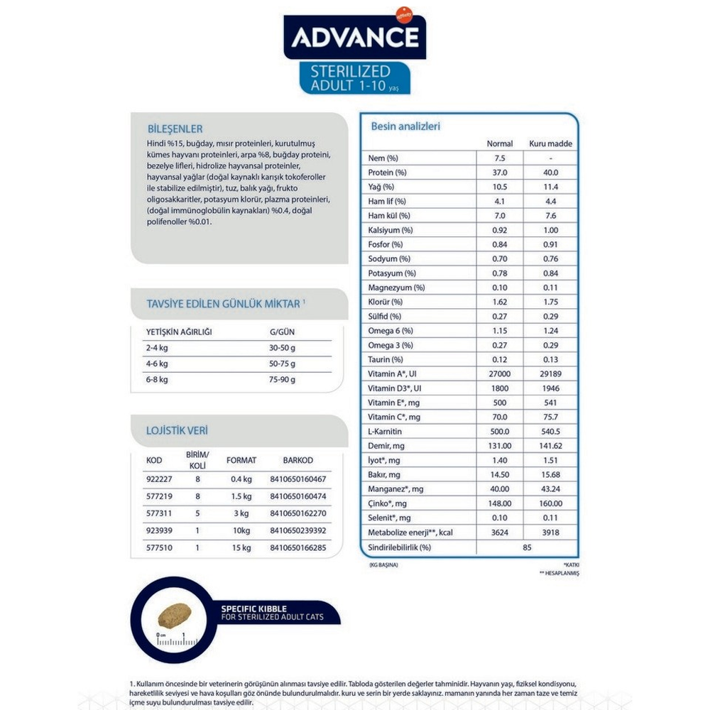 Hindi (%15), mısır proteini, tam mısır, dehidre kümes hayvanları proteinleri, dehidre domuz proteinleri, tam buğday (%8), tam taneli arpa (%8), dehidre bezelye (%4), buğday proteini, hidrolize hayvansal proteinler (kümes hayvanları, domuz, balık), bezelye lifi, mineraller, domuz yağı, buğday kepeği, pancar küspesi (%1,2), balık yağı, hindiba inulini (%0,6), domuz plazma proteinleri (doğal immünoglobulin kaynağı) (%0,4)