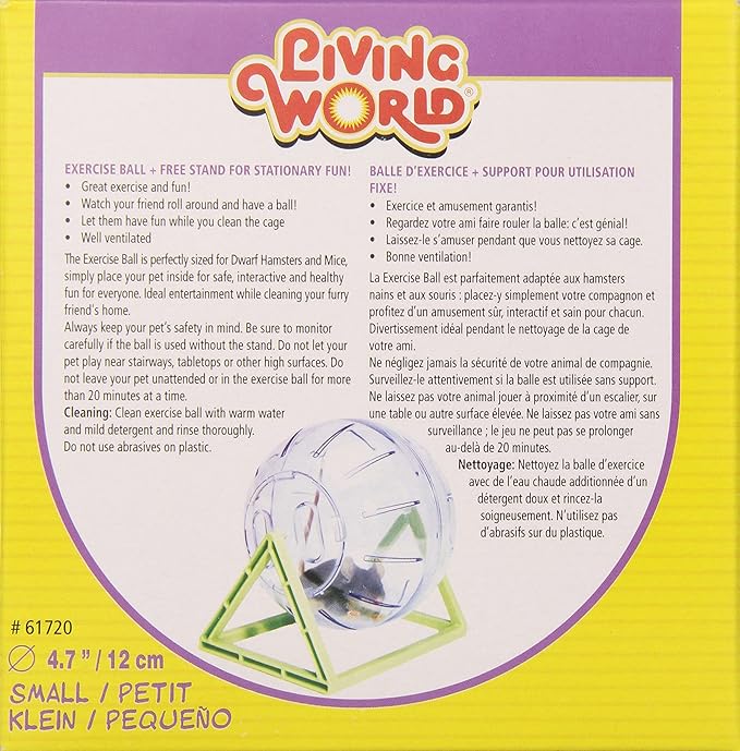 Living World's Exercise Ball küçük evcil hayvanların ihtiyaç duydukları egzersizi almalarını sağlayan güvenli, mobil bir ortam sağlar. Güvenli, etkileşimli ve sağlıklı aktivite için evcil hayvanınızı Egzersiz Topunun içine yerleştirin ve evcil hayvanınızı yakından izlediğinizden emin olun. Egzersiz, küçük hayvanlar için çok önemlidir, çünkü onları güçlü ve sağlıklı tutmaya yardımcı olur. Egzersiz topu toksik olmayan, kırılmaz, şeffaf plastikten yapılmıştır ve sürekli hava sirkülasyonu sağlamak için iyi havalandırılmıştır. Temizliği kolaydır, sadece ılık su ve yumuşak bir deterjan kullanın ve iyice durulayın. Cüce hamster ve fareler için. Küçük.